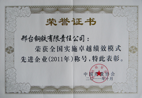 Xingtai Steel was awarded the NationalModel Enterprise of Harmonious Labor Relationship which issued by Ministry of Human Resources and Social Security of the People's Republic of China (MOHRSS), All-China Federation of Labor,China Enterprise Confederation(CEC) and All-China Federation Of Industry & Commerce.