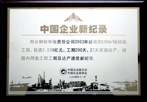 Invested 204 million yuan in 2003, Xingtai Steel's 180m3 sinter plant was built in 290 days and achieved designed capacity within 27 days, this set up a new record for alike projects of China.