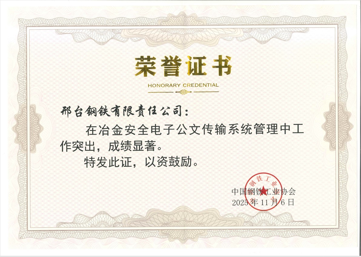 2025年11月,邢鋼在冶金安全電子公文傳輸系統(tǒng)管理工作中表現(xiàn)突出,被中國鋼鐵工業(yè)協(xié)會評為先進單位。