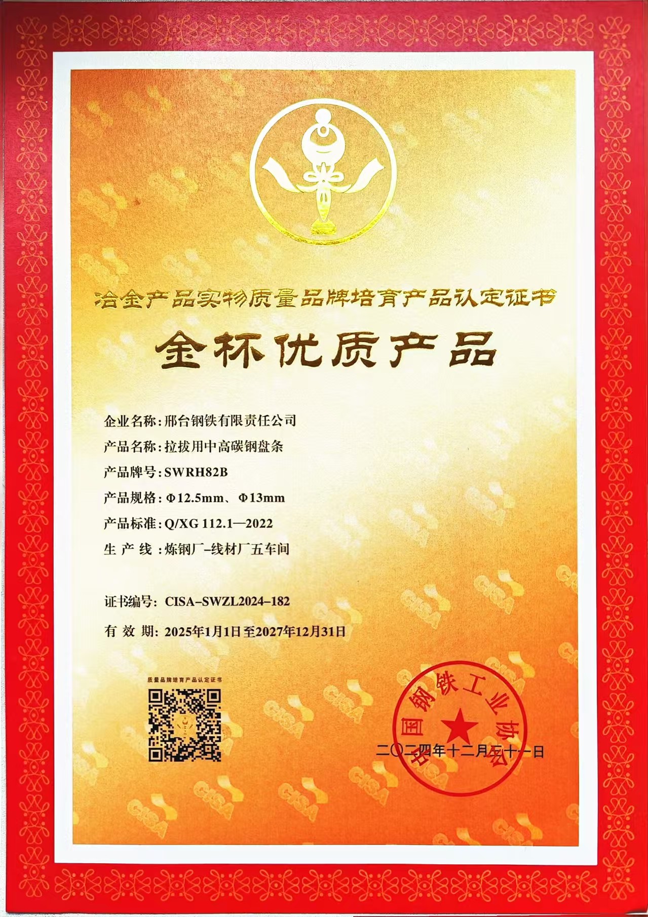 2024年公司含硼冷鐓及冷擠壓用精品盤條XG10B21產(chǎn)品獲得冶金產(chǎn)品實物質(zhì)量品牌培育產(chǎn)品(金杯優(yōu)質(zhì)產(chǎn)品)認定證書,簡稱金杯獎。“冶金產(chǎn)品實物質(zhì)量品牌培育”評選活動于24年3月啟動,由中國鋼鐵工業(yè)協(xié)會主辦,金杯獎是中國鋼鐵工業(yè)協(xié)會組織的冶金行業(yè)唯一的比較權(quán)威的獎項,