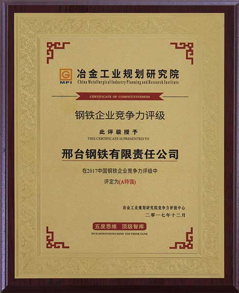 2017年12月,冶金工業(yè)規(guī)劃研究院競爭力評級中心授予邢鋼“在2017中國鋼鐵企業(yè)競爭力評級中評定為A特強”企業(yè)。