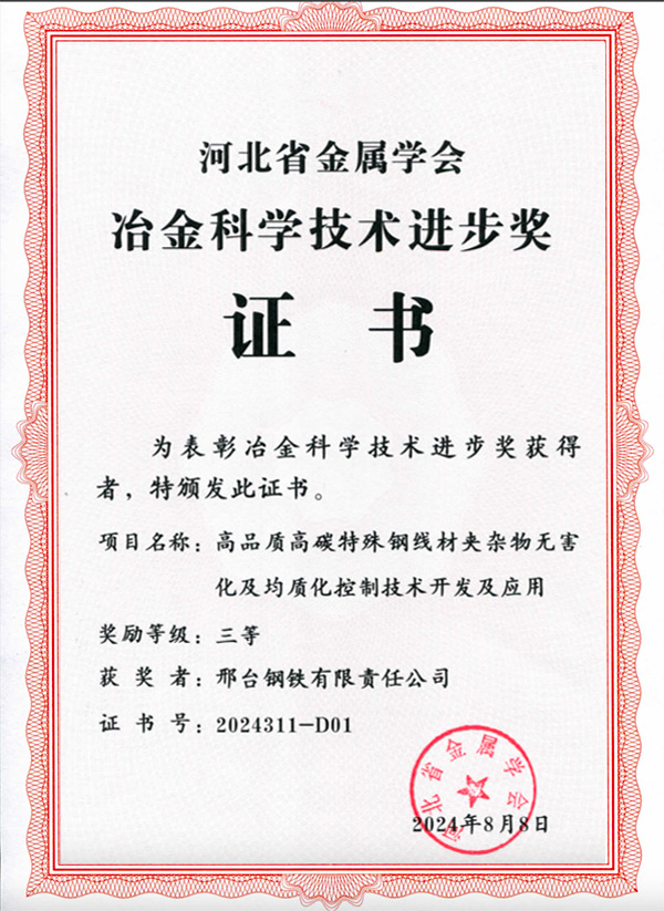 2024年8月8日,《高品質(zhì)高碳特殊鋼線材夾雜物無害化及均質(zhì)化控制技術(shù)開發(fā)及應(yīng)用》項(xiàng)目榮獲河北省冶金科學(xué)技術(shù)進(jìn)步獎(jiǎng)三等獎(jiǎng)。