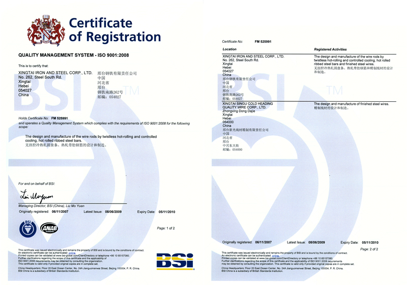 2007年11月6日,邢鋼獲ISO 9001:2008質(zhì)量管理體系認(rèn)證證書。