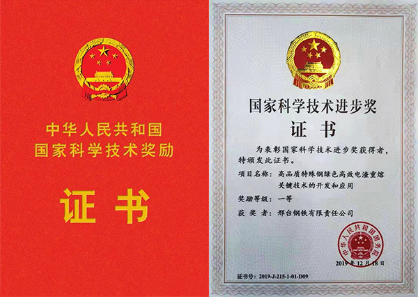 2020年1月10日,2019年度國家科學(xué)技術(shù)獎(jiǎng)勵(lì)大會(huì)在人民大會(huì)堂隆重舉行。邢鋼作為主要完成單位之一,完成的《高品質(zhì)特殊鋼綠色高效電渣重熔關(guān)鍵技術(shù)的開發(fā)和應(yīng)用》,喜獲國家科學(xué)技術(shù)進(jìn)步一等獎(jiǎng),系全國鋼鐵行業(yè)十五年來首次獲此殊榮。
