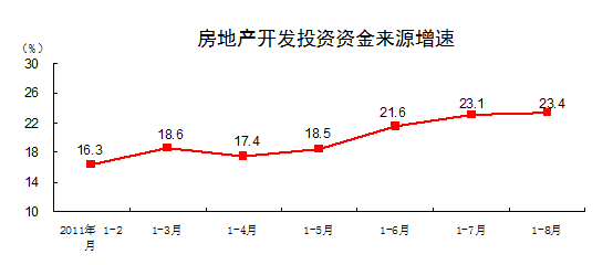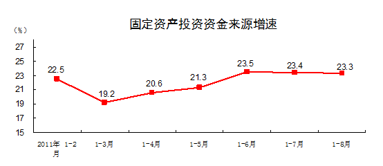 從到位資金情況看,1-8月份,到位資金212194億元,同比增長23.3%。其中,國家預算內(nèi)資金增長13.1%,國內(nèi)貸款增長9%,自籌資金增長29.4%,利用外資增長14.1%,其他資金增長17.3%。