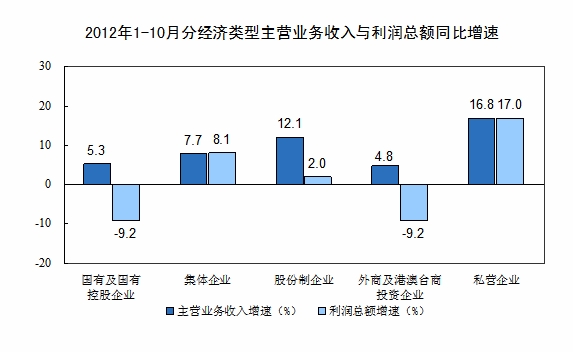 1-10月份,在規(guī)模以上工業(yè)企業(yè)中,國有及國有控股企業(yè)實(shí)現(xiàn)利潤11270億元,同比下降9.2%;集體企業(yè)實(shí)現(xiàn)利潤630億元,同比增長8.1%;股份制企業(yè)實(shí)現(xiàn)利潤23526億元,同比增長2%;外商及港澳臺(tái)商投資企業(yè)實(shí)現(xiàn)利潤9195億元,同比下降9.2%;私營企業(yè)實(shí)現(xiàn)利潤12623億元,同比增長17%。