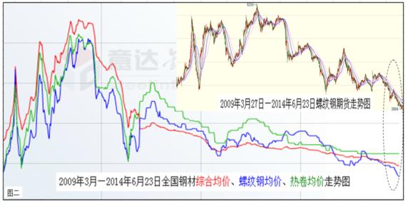 底線的提高,勢(shì)必助推中國經(jīng)濟(jì)大勢(shì)呈現(xiàn)前低后高的走勢(shì)。而經(jīng)過長(zhǎng)期低迷的中國鋼材市場(chǎng),也已經(jīng)具備逐漸走強(qiáng)的兩大要素:一是鋼市走強(qiáng)的外在環(huán)境趨好(見上圖一)。包括上半年推出一系列微刺激效應(yīng)逐漸顯現(xiàn),下半年由于經(jīng)濟(jì)增長(zhǎng)底線提高,以及持續(xù)加推的動(dòng)力措施等合成發(fā)酵,定會(huì)形成遠(yuǎn)比上半年良好的鋼市發(fā)展環(huán)境;二是鋼市走強(qiáng)的內(nèi)在動(dòng)能充沛(下圖二)。鋼材價(jià)格經(jīng)過長(zhǎng)期下跌后,已經(jīng)下穿了所有的技術(shù)阻力位,使業(yè)內(nèi)根本無法從技術(shù)面進(jìn)行詮釋。但從價(jià)值規(guī)律、市場(chǎng)規(guī)律以及基本面情況看,目前鋼材價(jià)格的底部特征已經(jīng)十分明顯,空方量能也已近衰竭。因此,經(jīng)過短時(shí)間的整固蓄勢(shì)后,震蕩上揚(yáng)應(yīng)該是后期運(yùn)行的主基調(diào)。如果再結(jié)合宏觀上經(jīng)濟(jì)增長(zhǎng)底線的提高,下半年鋼材價(jià)格恢復(fù)性上揚(yáng)既在情理之中,也是勢(shì)所必然。所以,基于經(jīng)濟(jì)和鋼市大勢(shì)筆者作出,下半年全國鋼材價(jià)格勢(shì)必高于上半年的預(yù)測(cè)。