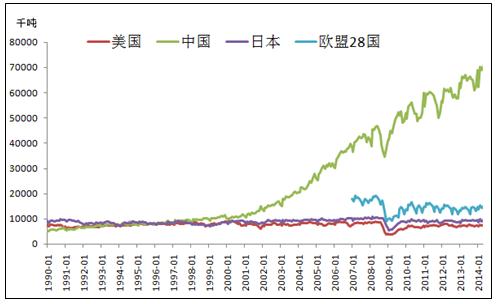 中國是鋼鐵生產(chǎn)大國,粗鋼產(chǎn)量在全球遙遙領(lǐng)先。自2002年開始中國開始進(jìn)入經(jīng)濟(jì)飛速發(fā)展時期,粗鋼產(chǎn)量一直保持高速增長,到2013年粗鋼產(chǎn)量已達(dá)7.7億噸,約占全球產(chǎn)量的49.1%。美國,日本等鋼鐵生產(chǎn)大國,其對鋼鐵的需求已經(jīng)放緩,粗鋼產(chǎn)量一直保持穩(wěn)定狀態(tài),所以粗鋼產(chǎn)量的增長大部分來自于中國。(見圖1)