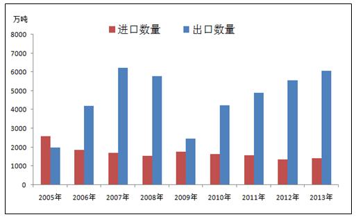 近幾年,中國鋼鐵的進(jìn)口很穩(wěn)定波動不大,出口處于穩(wěn)健增長狀態(tài)。出口量增加的原因一是因為經(jīng)濟(jì)危機(jī)后各國經(jīng)濟(jì)都在緩慢復(fù)蘇中,主要經(jīng)濟(jì)體制造業(yè)景氣表現(xiàn)出現(xiàn)回升,2014年上半年全球制造業(yè)PMI指數(shù)平均值為52.58,達(dá)到了近兩年來相對高位的水平。另外新興經(jīng)濟(jì)體對國家基礎(chǔ)設(shè)施建設(shè)和民用建筑的投資不斷增大,對鋼材的需求明顯增加;二是中國鋼材價格相較于其他出口國較為低廉,且近期鋼價仍在不斷下跌,這增強(qiáng)了中國鋼材在國際貿(mào)易市場上的競爭力。2014年上半年,中國出口量為3930.37萬噸,同比增加1038.37萬噸,同比增幅為35.9%。(見圖2)