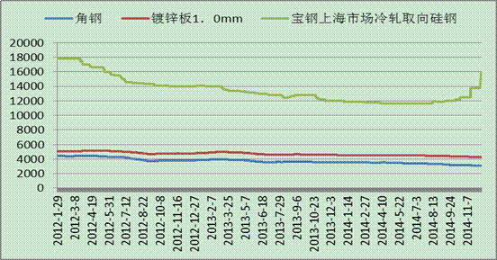 據(jù)鋼聯(lián)資訊跟蹤的部分電網(wǎng)建設(shè)用鋼價(jià)格走勢(shì)顯示,近3年來(lái),由于鋼鐵產(chǎn)能的嚴(yán)重過(guò)剩以及下游投資建設(shè)需求的回落,鋼材價(jià)格一路持續(xù)下跌。其中用于變壓器的冷軋取向硅鋼價(jià)格從最高17800元/噸跌至13800元/噸,跌幅達(dá)22.5%,其中最低跌至11600元/噸。角鋼價(jià)格亦從最高4435元/噸跌至3094元/噸,鍍鋅板價(jià)格從最高5052元/噸下跌至4267元/噸,跌幅分別達(dá)30.2%和15.5%。從圖中可以看出,三個(gè)品種的價(jià)格在2012年跌幅相對(duì)較大。此后,價(jià)格逐步呈現(xiàn)陰跌的走勢(shì),跌幅有所收窄,冷軋取向硅鋼價(jià)格在特高壓政策利好之下,率先小幅拉升,其他兩個(gè)品種鋼材因使用面廣,依舊維持震蕩走勢(shì)。