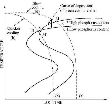 上圖曲線1、2分別是高P鋼、低P鋼的恒溫轉變曲線,也可以分別表示同一鋼中高P區(qū)和低P區(qū)的恒溫轉變曲線。在控制冷卻速率較慢的情況下,如曲線(a)所示,鐵素體將會先在M點形核。因為P能夠提高C的活度系數(shù),所以高P區(qū)域C的活度較高,但實際濃度卻偏低,鐵素體的形核時會推動C元素向低P區(qū)域、原本C濃度高(活度低)的區(qū)域擴散,這樣就會造成C元素偏聚,形成帶狀組織;如果冷卻速率較快,如(b)所示,鐵素體會先在Nˊ點(低P區(qū))形核,促進C元素向高P區(qū)域、原來C濃度較低的區(qū)域擴散,會使C分布的更加均勻,鐵素體和珠光體都會隨機形核長大,減弱或抑制帶狀組織形成。