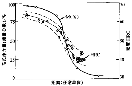 在未淬透的情況下,如何確定工件淬硬層深度呢?從理論上講,淬硬層應(yīng)為全馬氏體組織,但由于金相組織上淬硬區(qū)與非淬硬區(qū)無(wú)明顯界限,而馬氏體量由表面到心部是逐漸減少的。實(shí)際上馬氏體中混有一定量非馬氏體組織,如5~10%屈氏體時(shí),在顯微觀察及硬度測(cè)量上都不易察覺(jué)。因此,通常將具有50%馬氏體處確定為淬硬層邊界,即從工件表面到50%馬氏體區(qū)的距離定為淬硬層深度,因?yàn)楹?0%馬氏體區(qū)是硬度值急劇變化的地方,如下圖所示: