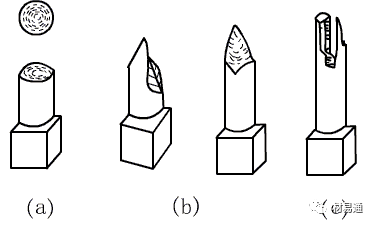 塑性材料斷口與試件的軸線垂直,斷口平整并有回旋狀塑性變形痕跡(圖a),這是由切應(yīng)力造成的切斷;