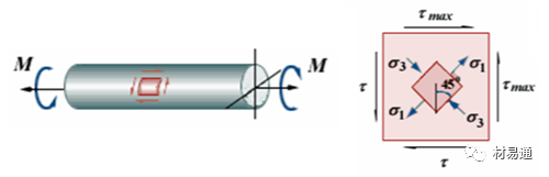 純扭轉(zhuǎn)時圓試樣的表面處于純剪應(yīng)力狀態(tài),與桿軸成±45º角的螺旋面上分別作用著兩個主應(yīng)力: σ1、σ3 并與最大剪應(yīng)力τmax絕對值數(shù)值相等。因此試樣的斷口角度直接顯示材料是拉斷還是剪斷、材料自身抗拉、抗剪能力的強弱由此得到直接地比較。