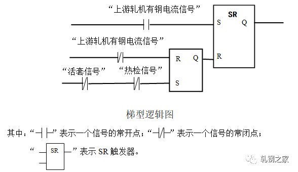 在軋件頭部進(jìn)入活套后面軋機(jī)前不允許起套輥升起;在軋件頭部進(jìn)入活套后面軋機(jī)后起套輥必須立即升起。當(dāng)軋件尾部離開活套前面軋件時(shí),起套輥必須立即下降。為了準(zhǔn)確地起落套,我們首先,在活套的起落套的邏輯控制程序中設(shè)置了RS觸發(fā)器。只要下游機(jī)架“有鋼”活套就不能再次起落套。編程如下(梯型邏輯圖):其次,在起套和落套的處理上對(duì)延時(shí)時(shí)間采用了長(zhǎng)度系數(shù)補(bǔ)償?shù)乃惴?,即在?jì)算定時(shí)器的延時(shí)時(shí)間過程中將線材要走的長(zhǎng)度(如兩機(jī)架間的距離)乘以一個(gè)百分比。這樣就可以:一、消除由于CPU軟件系統(tǒng)本身運(yùn)行周期過長(zhǎng)造成的定時(shí)計(jì)算誤差;二、靈活地適應(yīng)電氣開關(guān)和機(jī)械上氣閥等的動(dòng)作滯后的不一致性,以使起套輥能較準(zhǔn)確地升起和落下。