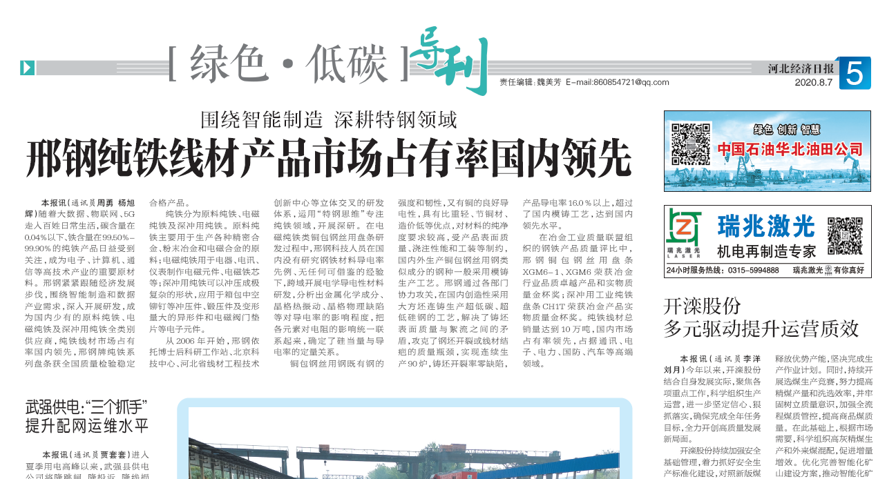 在冶金工業(yè)質(zhì)量聯(lián)盟組織的鋼鐵產(chǎn)品質(zhì)量評(píng)比中,邢鋼銅包鋼絲用盤條XGM6-1、XGM6榮獲冶金行業(yè)品質(zhì)卓越產(chǎn)品和實(shí)物質(zhì)量金杯獎(jiǎng);深沖用工業(yè)純鐵盤條CH1T榮獲冶金產(chǎn)品實(shí)物質(zhì)量金杯獎(jiǎng)。純鐵線材總銷量達(dá)到10萬(wàn)噸,國(guó)內(nèi)市場(chǎng)占有率領(lǐng)先,占據(jù)通訊、電子、電力、國(guó)防、汽車等高端領(lǐng)域。