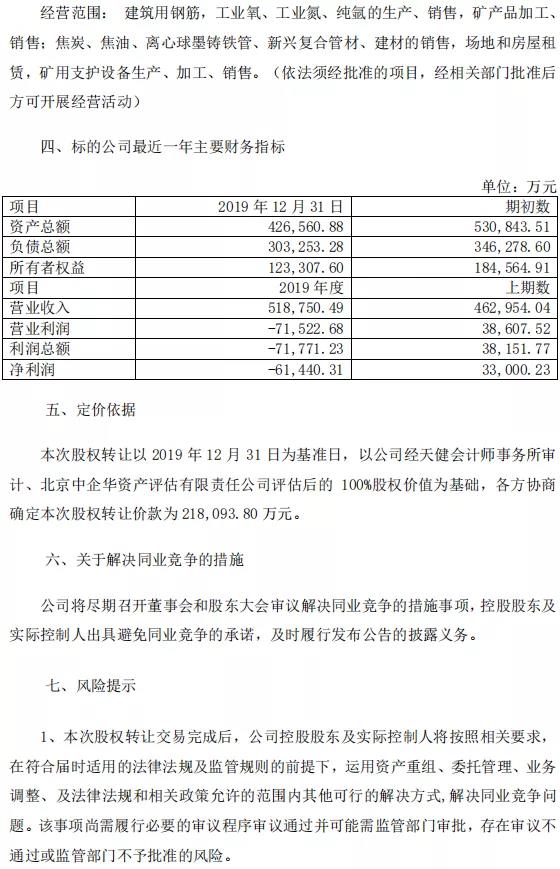 11月13日晚間,八一鋼鐵發(fā)布公告稱(chēng),該公司控股股東寶鋼集團(tuán)新疆八一鋼鐵有限公司的控股子公司新疆天山鋼鐵聯(lián)合有限公司擬受讓深圳九天清控投資合伙企業(yè)持有的新興鑄管新疆有限公司100%股權(quán)。11月13日,天山鋼鐵與九天清控簽署了《股權(quán)轉(zhuǎn)讓協(xié)議》。本次股權(quán)轉(zhuǎn)讓以2019年12月31日為基準(zhǔn)日,以公司經(jīng)天健會(huì)計(jì)師事務(wù)所審計(jì)、北京中企華資產(chǎn)評(píng)估有限責(zé)任公司評(píng)估后的100%股權(quán)價(jià)值為基礎(chǔ),各方協(xié)商確定本次股權(quán)轉(zhuǎn)讓價(jià)款為21.81億元。