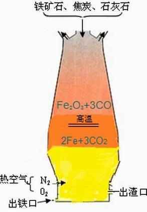 高爐生產(chǎn)時,從爐頂裝入鐵礦石、焦炭、造渣用熔劑(石灰石),從位于爐子下部沿爐周的風口吹入經(jīng)預(yù)熱的空氣。在高溫下焦炭中的碳同鼓入空氣中的氧燃燒生成的一氧化碳和氫氣,在爐內(nèi)上升過程中除去鐵礦石中的氧,從而還原得到鐵。煉出的鐵水從鐵口放出。