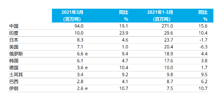 2021年1-3月粗鋼產(chǎn)量累計前十位的國家
