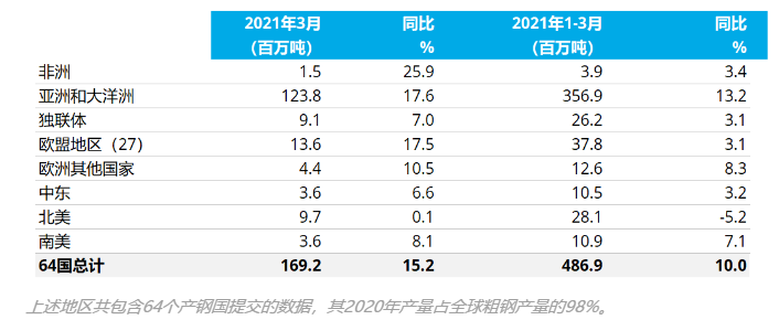 2021年3月全球64個納入世界鋼鐵協(xié)會統(tǒng)計國家的粗鋼產(chǎn)量為1.692億噸,同比提高15.2%。