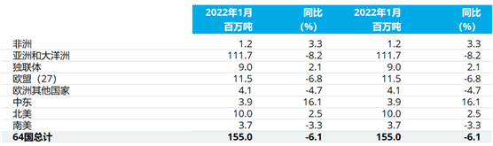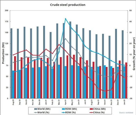 2022年1月全球64個(gè)納入世界鋼鐵協(xié)會(huì)統(tǒng)計(jì)國家的粗鋼產(chǎn)量為1.550億噸,同比下降6.1%。