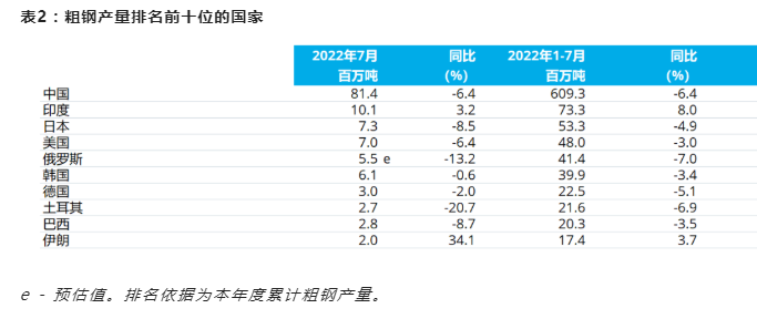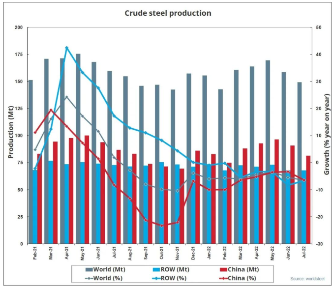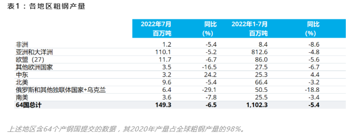 2022年7月全球64個(gè)納入世界鋼鐵協(xié)會(huì)統(tǒng)計(jì)國(guó)家的粗鋼產(chǎn)量為1.493億噸,同比下降6.5%。