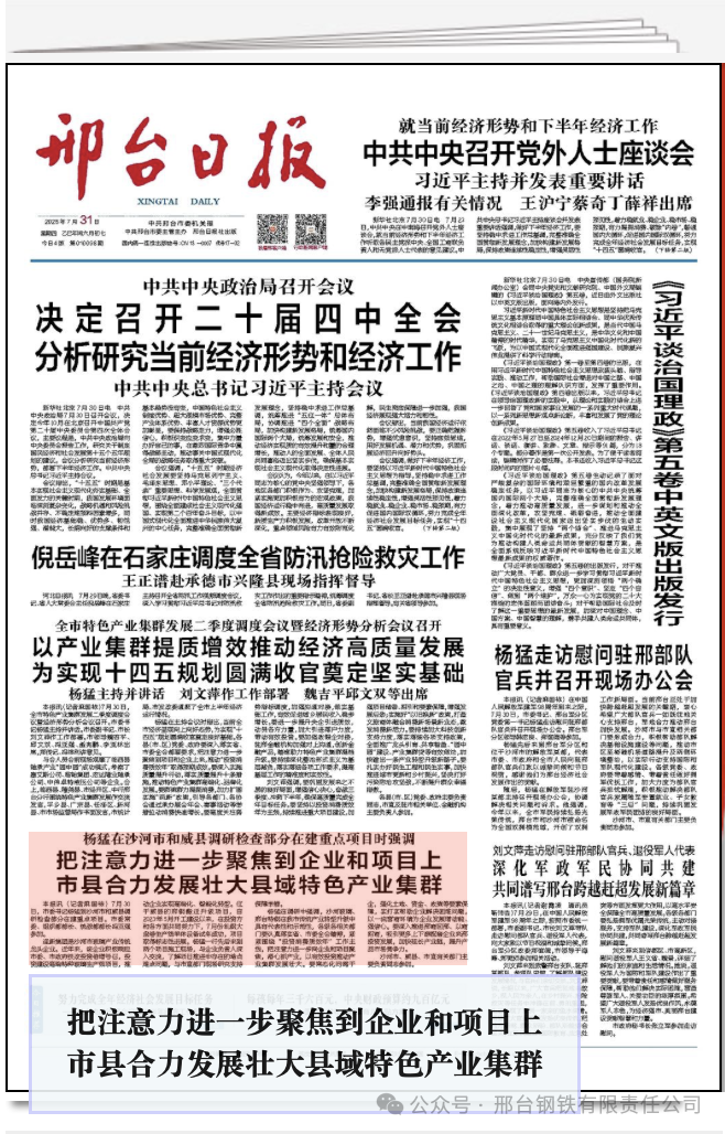 楊猛在調(diào)研中強(qiáng)調(diào),沙河玻璃、邢臺(tái)特鋼在我市傳統(tǒng)產(chǎn)業(yè)轉(zhuǎn)型升級中具有代表性和示范性,各級各相關(guān)部門要認(rèn)真落實(shí)省、市委全會(huì)精神,緊緊圍繞“投資消費(fèi)質(zhì)效年”工作主線,把注意力進(jìn)一步向企業(yè)和項(xiàng)目聚焦,潛心抓產(chǎn)業(yè),以有效投資推動(dòng)產(chǎn)業(yè)集群發(fā)展壯大。要常態(tài)化問需于企,強(qiáng)化土地、資金、政策等要素保障,實(shí)打?qū)崕椭髽I(yè)解決困難問題,以一流營商環(huán)境為企業(yè)發(fā)展增動(dòng)能、強(qiáng)信心。要深入推進(jìn)邢商回邢、以商招商,吸引更多上下游配套企業(yè)來邢投資發(fā)展,加快延長產(chǎn)業(yè)鏈,提升產(chǎn)品市場競爭力。