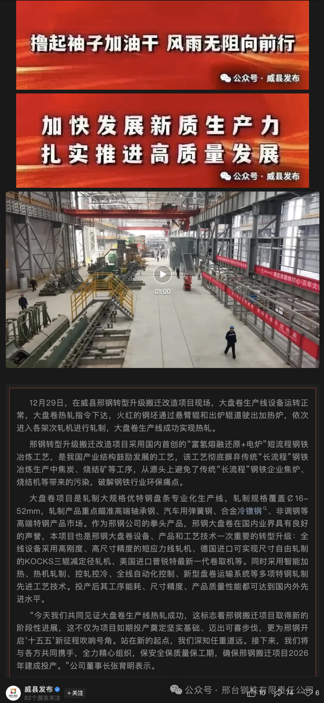 “今天我們共同見證大盤卷生產(chǎn)線熱軋成功,這標(biāo)志著邢鋼搬遷項(xiàng)目取得新的階段性進(jìn)展,這不僅為項(xiàng)目如期投產(chǎn)奠定堅(jiān)實(shí)基礎(chǔ)、邁出可喜步伐,更為邢鋼開啟‘十五五’新征程吹響號(hào)角。站在新的起點(diǎn),我們深知任重道遠(yuǎn)。接下來(lái),我們將與各方共同攜手,全力精心組織,保安全保質(zhì)量保工期,確保邢鋼搬遷項(xiàng)目2026年建成投產(chǎn)。”公司董事長(zhǎng)張育明表示。